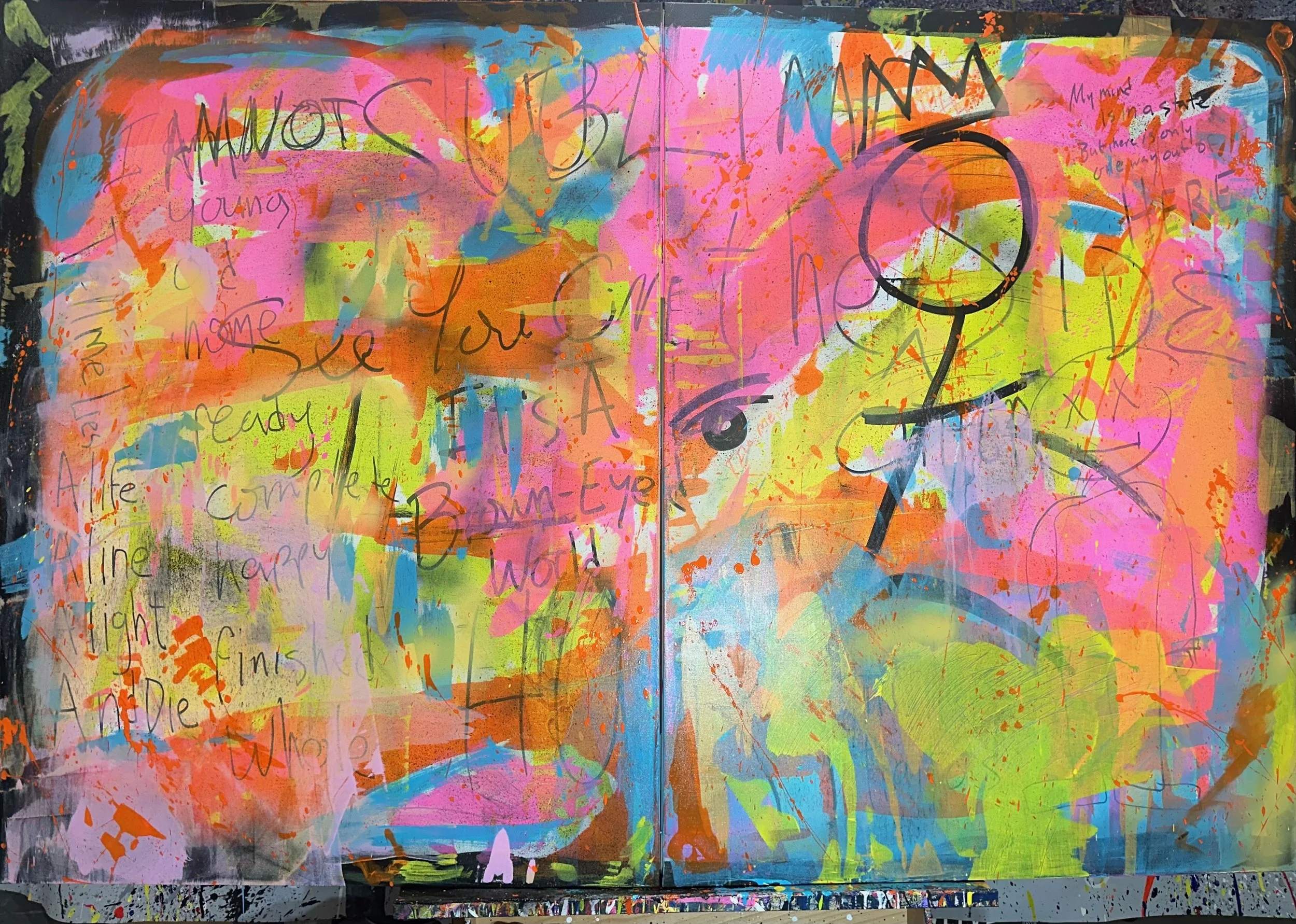 "Therapy," 2025, Marker, spray paint, pastel, and acrylic on prepared canvas, Two panels, each 48” x 36” (48” x72” total)